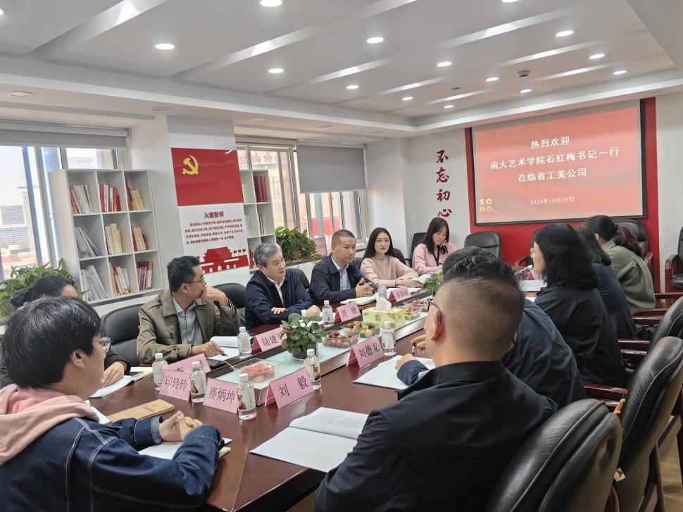 2024年10月29日,杏彩娱乐(中国)官方网站 党委书记石红梅一行前往江苏省工艺美术有限公司洽谈校企合作,双方就建立“南京大学艺术杏彩娱乐 学生实训基地”等议题进行了深入探讨。座谈会由江苏省工艺美术有限公司党支部书记、董事长姜国威主持。