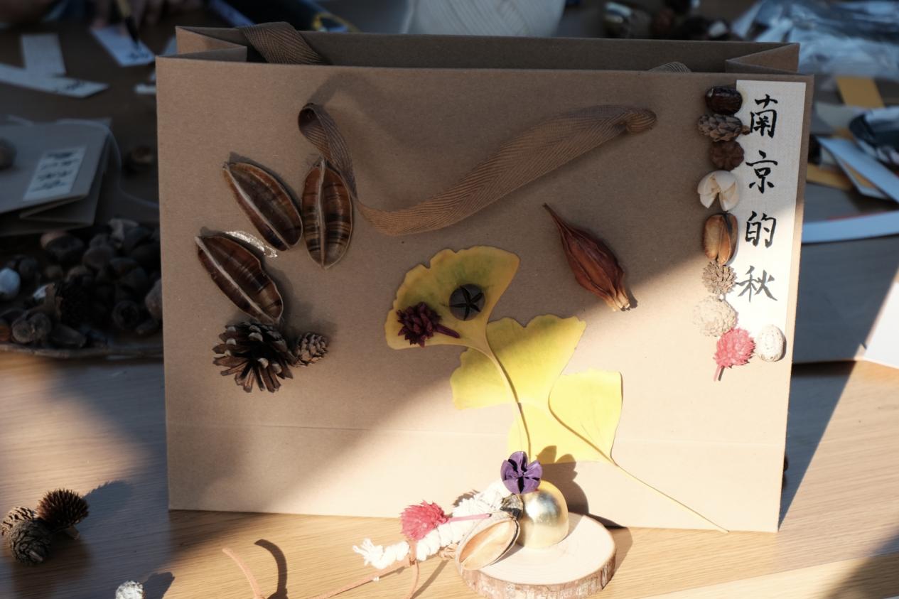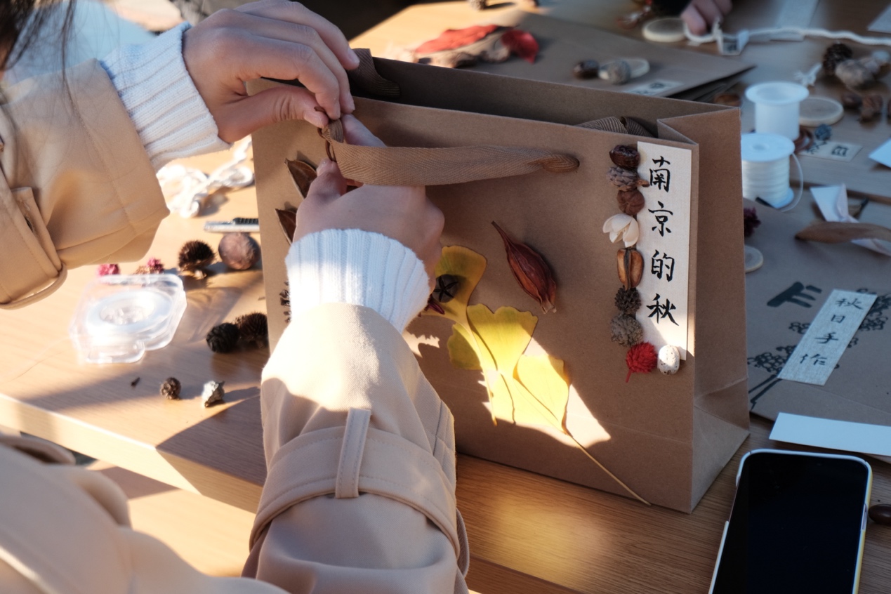 以橡果风铃的制作为核心,结合手绘纸袋装饰,为大家提供了一个释放艺术灵感与感受季节之美的机会。同学们在负责人的引导下,从捡拾秋天的橡果、叶片等自然元素开始,用手工串制风铃。纸袋上,杏彩娱乐 的学子充分发挥专业特长,将书法与秋日手作相结合,书写的南京之秋、绘制的卡通图案与小橡果、树叶们完美的融合在一起。制作过程中,大家沉浸于手作的乐趣中,感受着秋天的静谧与温暖。