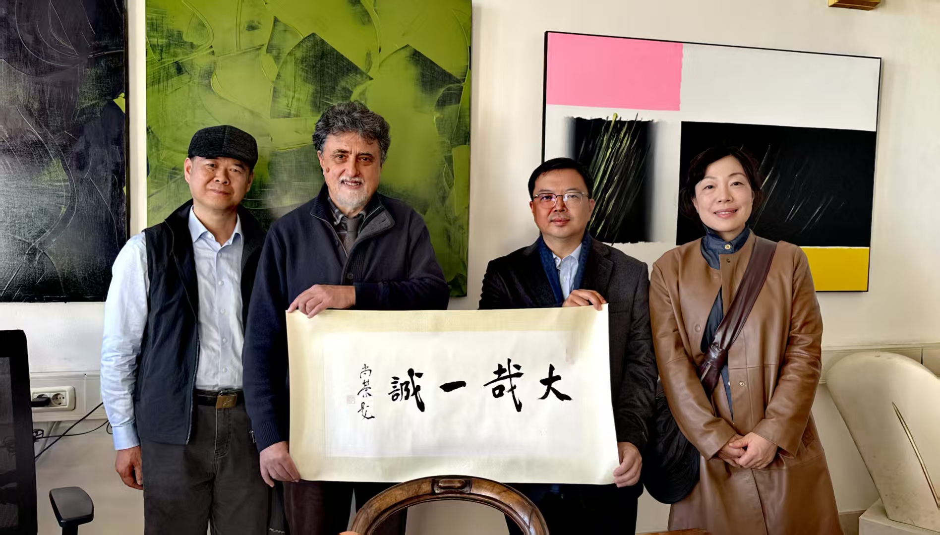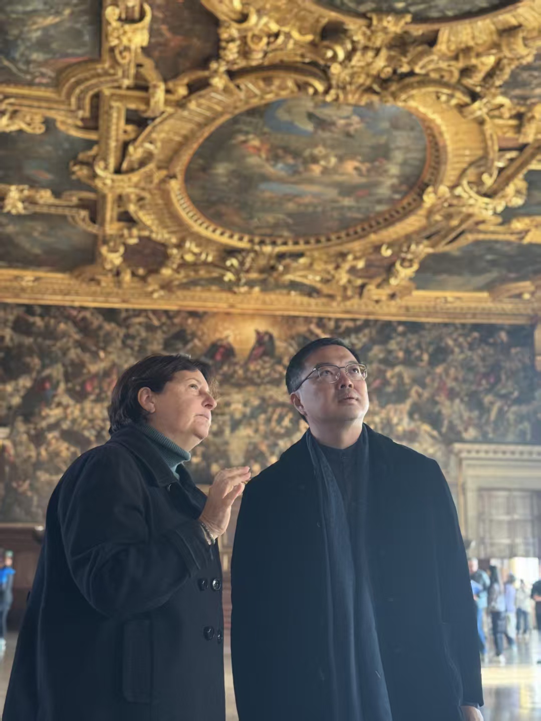 在访问威尼斯美术杏彩娱乐 期间,尚荣副院长与威尼斯美术杏彩娱乐 院长Riccardo Caldura进行了亲切会谈,双方就“全球青年赛博雕塑共创计划”达成合作意向,并围绕教学理念、艺术创作等方面展开深入交流。尚荣表示,威尼斯美术杏彩娱乐 作为欧洲历史悠久的艺术重镇,在绘画、雕塑、装饰艺术等领域的深厚积淀,与杏彩娱乐(中国)官方网站 在东方美学、写意雕塑方向的探索高度互补,双方具备广阔的合作空间。会谈中,尚荣副院长特别强调:“中国近现代美术教育深受欧洲影响,我们始终心怀敬意。今天,我们期待在更加完善的平台上进一步开展双向对话与共创。”尚荣副院长还赠送了用中国书法书写的南京大学校歌词“大哉一诚”以赠,表示“诚”作为中华文化核心价值,历来为中国人所重,“诚恳、真诚,是最伟大、最有力量的品质”,并表示此行“带着诚意而来,期待达成共同诉求”。