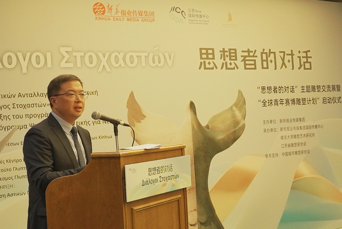 尚荣教授作为中方代表在开幕式上发表致辞,他表示,雕塑是跨越语言的思想载体,古希腊雕塑追求理性、和谐与人体之美,而中国雕塑则更重意境的营造、内在的观照与智慧的探寻。正是这些不同的艺术表达,构成了人类精神的丰富图谱。他强调,本次展出的九件雕塑作品,既紧扣“思想者的对话”主题,也展现了江苏雕塑在语言与风格上的多元探索,是一次“真诚的艺术问候”。
