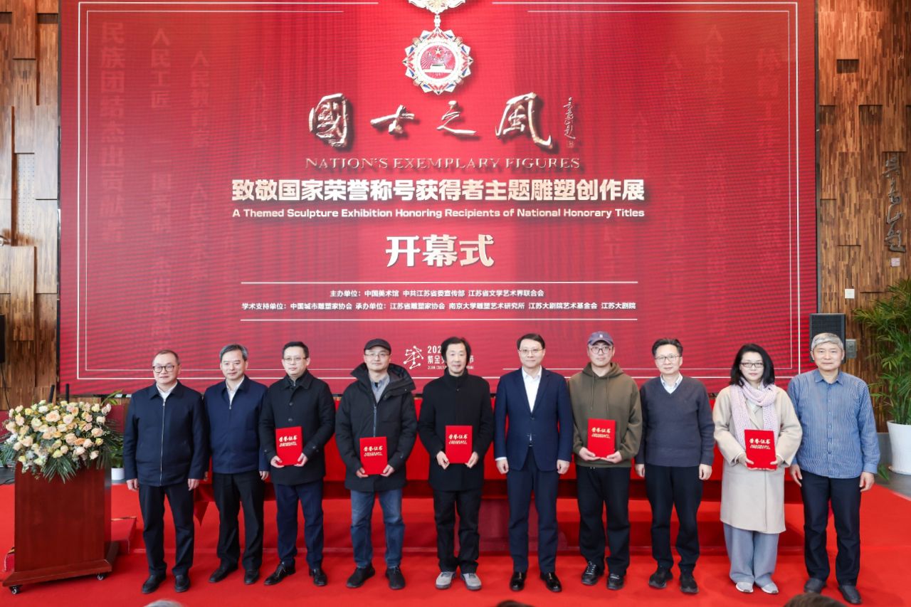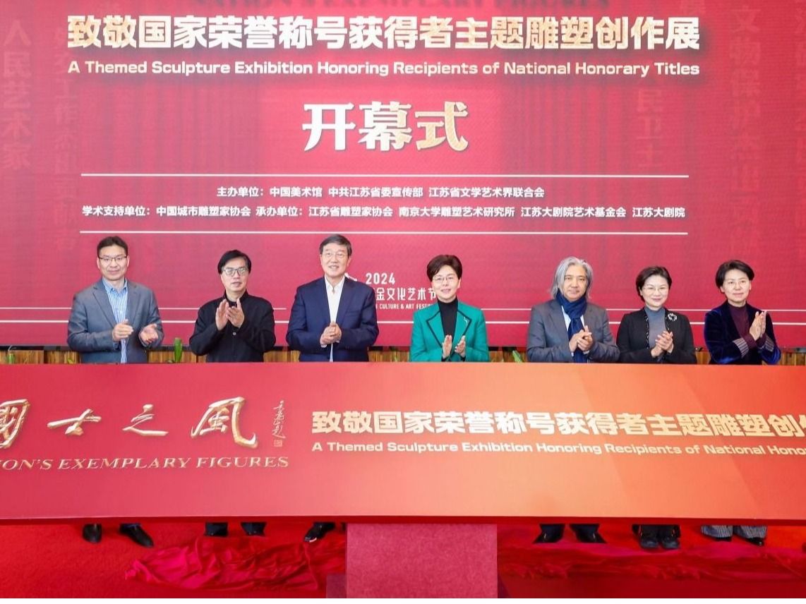 12月30日下午,2024“国士之风”致敬国家荣称号获得者主题雕塑创作展在江苏大剧院美术馆开幕。省委常委、宣传部部长徐缨,全国政协副秘书长、民盟中央专职副主席、中国美术馆馆长吴为山,江苏省政协副主席、党组成员姚晓东,江苏省委宣传部副部长徐宁,江苏省文联主席章剑华,江苏省文联党组书记、副主席、书记处第一书记常胜梅,江苏省文化投资管理集团有限公司党委书记、董事长、总经理叶飚荣出席开幕式并为展览揭幕。吴为山、徐宁、章剑华分别发表讲话。南京大学党委副书记陈云松出席开幕式并为参展代表颁发证书。