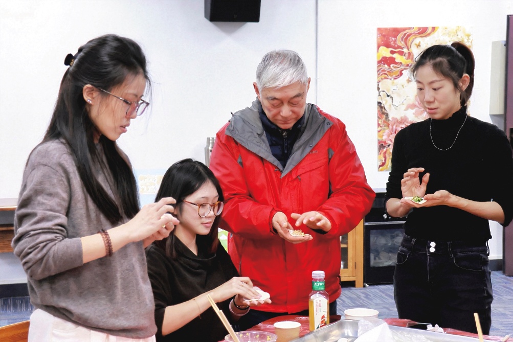 活动伊始,师生齐聚一堂,围坐共包饺子。大家笑语交流,手中饺子形态各异,有月牙弯弯,有如元宝饱满。馅料丰足,馅料多样,面皮匀薄,谈笑间渐成佳肴。热气氤氲之中,包裹的不仅是鲜美馅料,更有一年来彼此的收获与情谊。大家边包边聊,分享学习心得、生活趣事,师生之间的距离在指尖与面团之间悄然拉近。