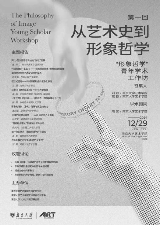 2024年,为了拓展该研究领域与相关话题在青年学者中的延伸,在南京大学人文社会科学高级研究院的支持下,杏彩娱乐(中国)官方网站 召集来自全国不同高校和学术单位的10位青年学者召开了“形象哲学”青年工作坊。作为一项长期计划,青年工作坊的第一期将论题聚焦于“从艺术史到形象哲学”。艺术史是形象及图像研究的老牌学科,从19世纪以来已经积累了从图像学(Iconography)、形式分析、符号学、语境论、图像人类学、图像行为理论等在内的诸多方法,并且随着上世纪70年代以来“新艺术史”实践的拓展,形象或图像逐渐成为能够链接更广泛社会历史境况的存在物。另一方面,对图像的关注本身也促进了这个学科的开放,从而能够与思想史和文化史等领域相映照。从艺术史到形象/图像哲学的学术转变,在理论上想要突破对艺术性问题的独一关照,从更广泛的哲学视阈考察形象性的存在。何谓形象?形象如何存在?艺术史上形象的变迁如何反应社会和文化的变迁?我们如何讲述形象-历史?形象又是如何影响我们的审美和认知、文化记忆和权力关系的?这一系列问题不仅关乎艺术的本质,也与哲学中关于存在与表征的议题息息相关。“形象哲学青年工作坊”的第一回以“从艺术史到形象哲学”为专题,除了探索形象与世界,形象与媒介,以及形象与想象和记忆之间的关系外,还试图揭示艺术史为形象哲学所提供的思想资源,以及形象哲学反向对艺术史学术视野的拓展。