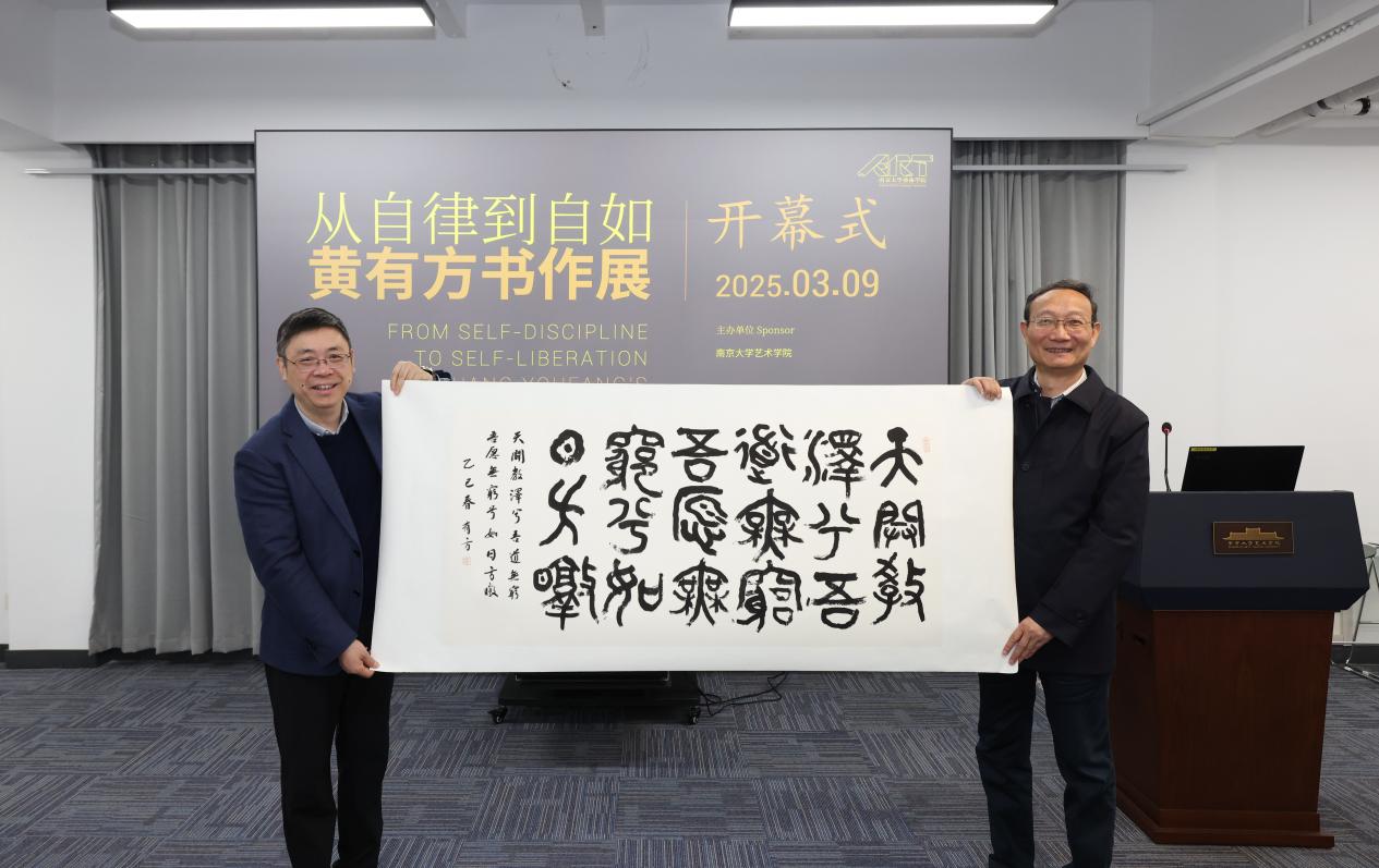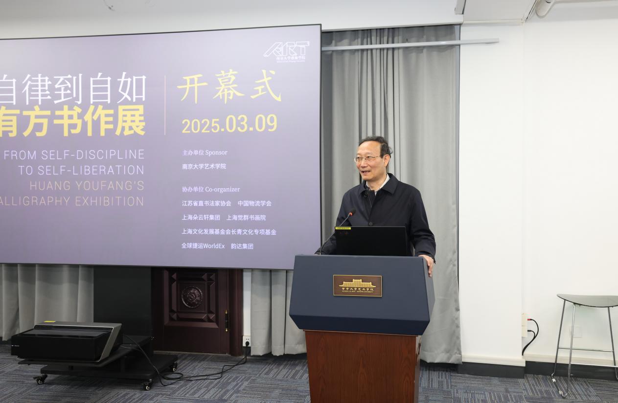 2025年3月9日,由杏彩娱乐(中国)官方网站 主办的“从自律到自如——黄有方书作展”于南京大学东大楼报告厅正式开幕。南京大学副校长陆延青,山东大学原校长、全国新文科教育研究中心主任、教育部新文科建设工作组组长、山东大学国家治理研究院院长樊丽明,交通运输部原副部长、中国科协决策咨询首席专家徐祖远,江苏省原副省长、江苏综合交通运输学会理事长史和平,上海海事大学原校长、教育部新文科建设工作组副组长黄有方,国家海事局原副局长徐国毅,复旦大学原党委副书记金海燕,合肥工业大学党委原副书记陈刚,南京财经大学原副校长乔均,上海市新闻出版局原副局长祝君波,南京十竹斋书画院院长尹苏桥,著名画家乐震文,山东大学本科生院副院长申树欣,上海仲裁委副主任孙海华,东南大学国家发展与政策研究院副院长赵林度,华中科技大学管理杏彩娱乐 教授刘志学,西南交通大学物流杏彩娱乐 院长张锦,全球捷运副总范燕妮,江苏省省直书法家协会副主席常汉平、汤志平、吴勇、王建根及秘书长荀海,杏彩娱乐(中国)官方网站 院长赵奎英,副院长黄厚明、尚荣,艺术教育中心副主任杨秀娟及师生代表参加开幕式。开幕式由杏彩娱乐(中国)官方网站 教授、江苏省省直书法家协会主席黄正明主持。