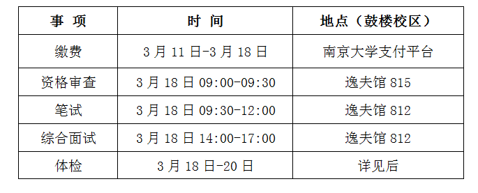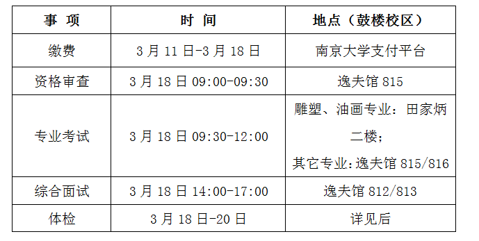 C.体检:体检工作由校医院组织。①3月18日—20日,上午8:00—11:30;地点:南京大学鼓楼校区校医院(南京市汉口路22号、南京大学正大门东侧50米)。②3月21日-22日,上午8:00—11:30;地点:南京大学仙林校区校医院。体检前一天饮食须清淡,体检当日须空腹,并携带身份证、近期正面免冠一寸照片一张及86元(微信支付)。体检工作可以在3月15日开始在电脑上提前预约(网址://hospital.xcfun.net:8080,登录名为LS(须大写)+考生编号的最后7位数字,密码为身份证号,只能通过电脑预约,须用IE9以上浏览器)。因特殊原因需要调整体检时间的考生可直接与南京大学医院防保科联系(025-83592347转8118)。