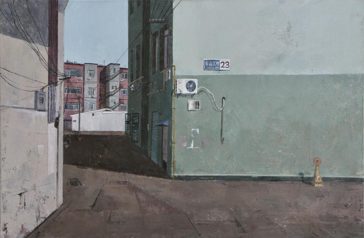 《旧时间之三》图绘阳光下老城区。构图上以大的疏密,详略得当,突出画面重点。色彩上主观处理,红绿对比为主,特别注重几块绿色的灰度以及白色的呼应关系。整体点线面非常注重节奏和空间,厚重的肌理表达墙面斑驳,力求表沧桑平和的感觉。