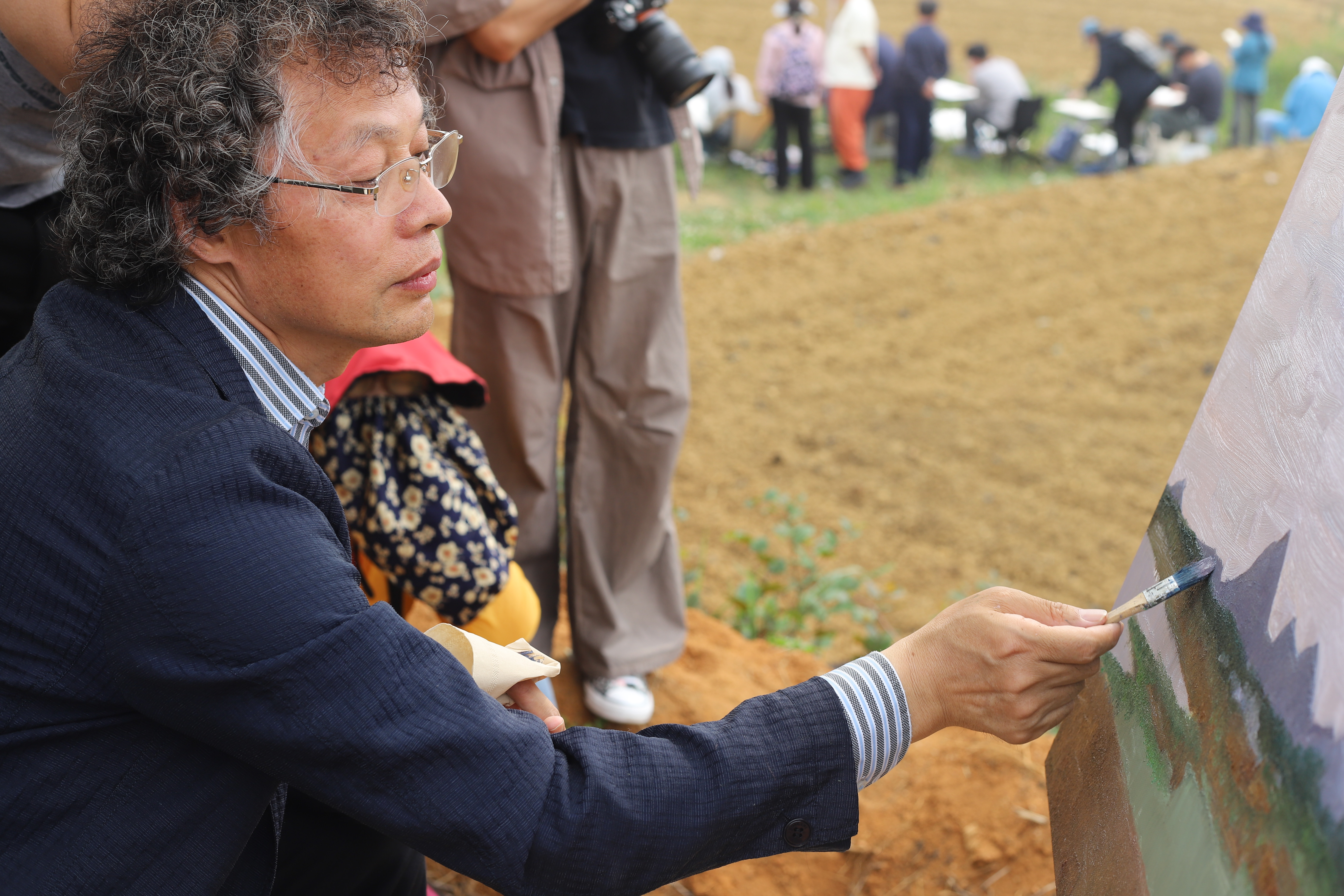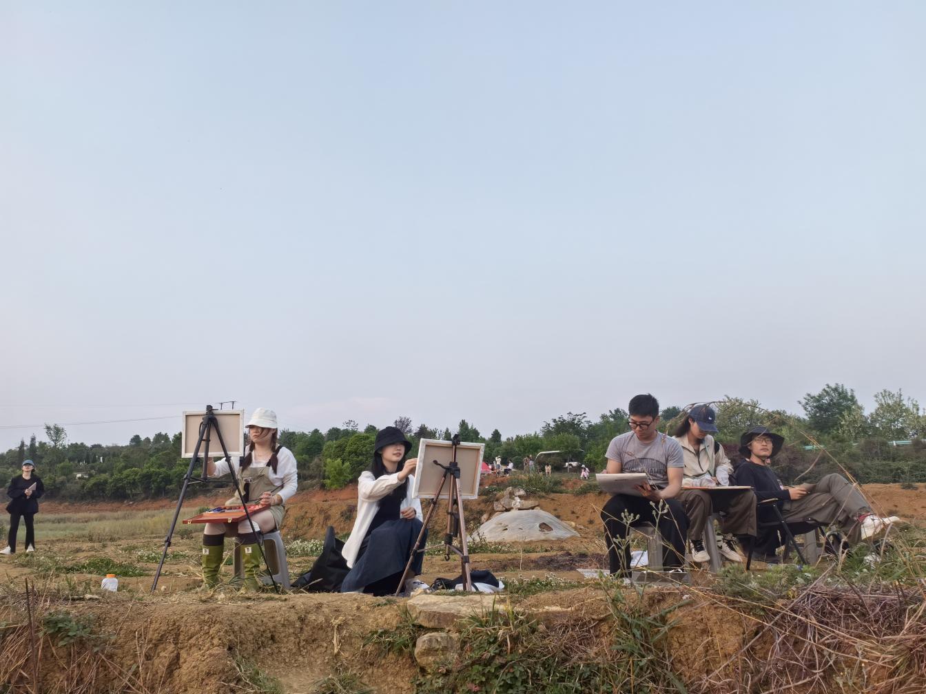 师生一行在村支书王常友、蒙安夕舍民宿主理人王庆能等带领下参观了红枫湖、晚樱园、茶园、屯堡文化据点等地,熟悉了解右二村及周边情况。在这片宁静土地上,师生们感受着大自然的呼吸,用心观察、细心记录身边的一草一木、一砖一瓦。在与同学们的采风交流中,陆庆龙老师也分享了自己的创作心得,要“感受生活、感受乡野、感受人生”,把握好在乡野间体悟和绘画的机会。陆庆龙、刘德龙、任艳明三位老师分别选择了右二村水田和当地村民进行油画、雕塑示范和技法讲解,引导同学们如何在乡野中抓住表现重点。