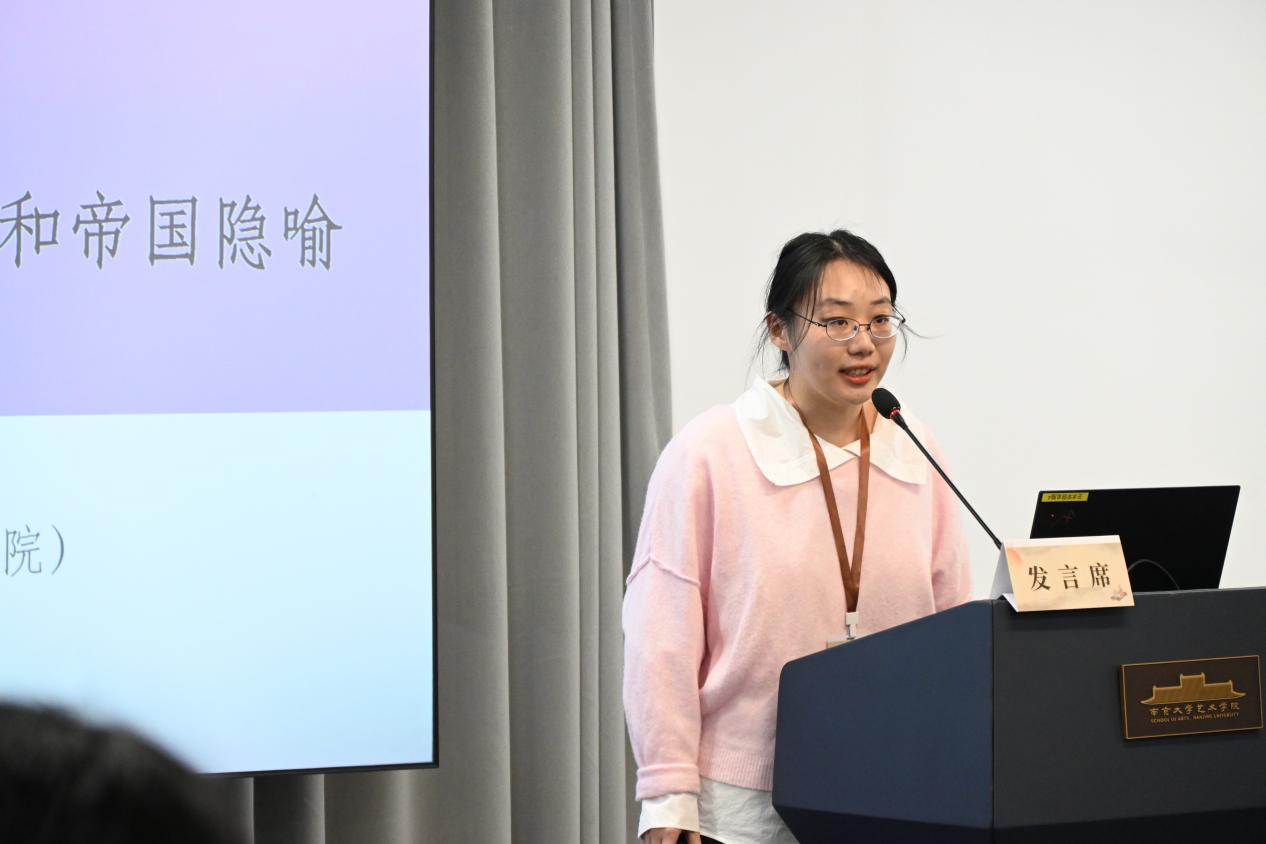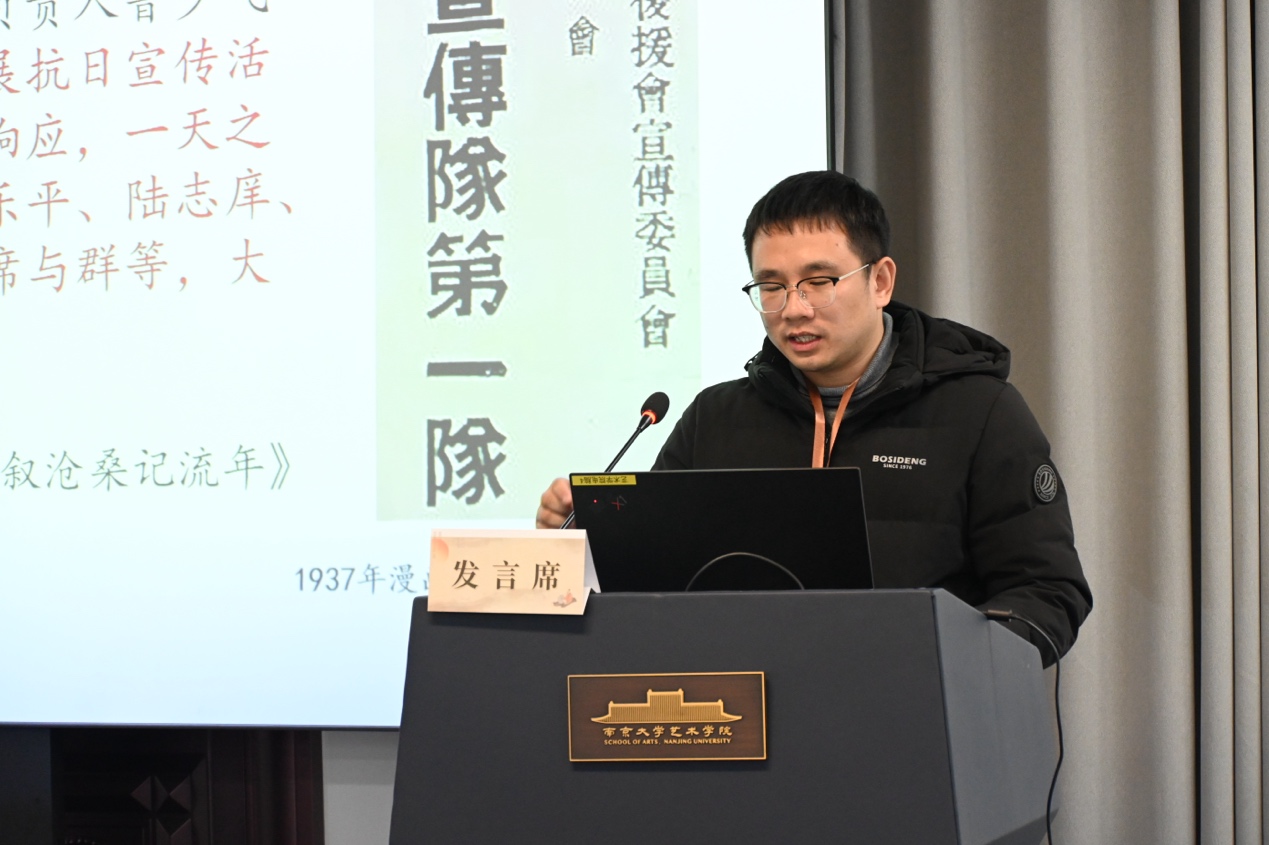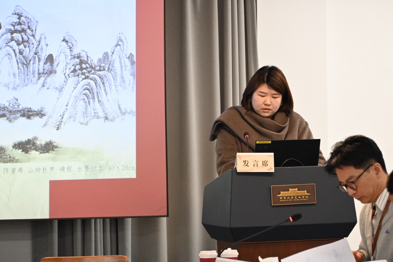 第二场“记忆与情感”专题,钱慧以《从“市民音乐”到“日常生活中的音乐——宋代城市音乐研究的视角取向及理论探索》为题,倡导从社会史与日常生活出发重审宋代城市音乐中的情感经验;黄千相在《跨世题咏中的文脉赓续——从〈友古图〉题跋看金氏家族与清末江南鉴藏圈的百年联结》中,通过题跋与家族记忆揭示鉴藏活动中情感与文脉的代际延续;杜秀萍以《荒诞旧梦:清遗民绘画中的幻境图像与族群身份危机》探讨清遗民借助梦境图像回应现代性断裂下的情感焦虑;李光耀则在《国族、情爱与交游圈:再议救亡漫画宣传队的组建动因》中,从私人情感与交游网络切入,重释抗战语境中艺术行动的情感动力。本场汇报由陈平主持,杨祥民、叶蓉丹、丁澜翔分别进行评议,从研究视角、材料运用与情感史书写路径等方面提出了意见。