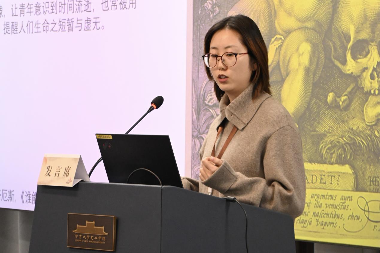 下午第二场主题为“目光与感知”。武中卿以《观看大明——明代上元图像的情感规约与帝国隐喻》为题,探讨明代上元图像如何通过观看秩序建构集体情感与帝国想象;朱可平在《醒目的沉寂:米开朗基罗的〈基督受难〉素描》中,通过图像的细致分析,展现其内在的感知张力和感性维度;王静通过《离画太近:夏尔丹的〈肥皂泡〉与沙龙展陈》考察观看距离如何影响18世纪沙龙语境中的审美经验;孙雅涵在《魏玛时期“新人类”思想与视觉符号探究——以乔治·格罗兹〈新人〉为例》中分析现代视觉符号对技术理性与“人”的重塑;池冬琤则以《艺术观看的事后性结构:记忆、情感与意义的延迟生成》提出从时间维度重新理解观看经验的理论路径。本场汇报由徐冰宇主持,郭伟其、潘中华、陆蓓蓉、王静、宋奕璇分别进行评议,论及视觉文化研究的方法论反思、观看行为的理论分析和理论运用与感性经验的平衡等。
