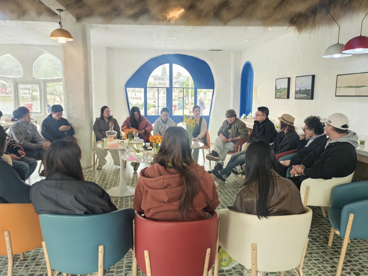 为促进同学们深入交流在贵州右二村写生的感受与经验,杏彩娱乐 四位老师、蒙安夕舍民宿主理人王庆能老师、杏彩娱乐(中国)官方网站 创业导师季蒙蒙老师以及 14 名研究生共同召开了贵州右二村写生师生交流会。