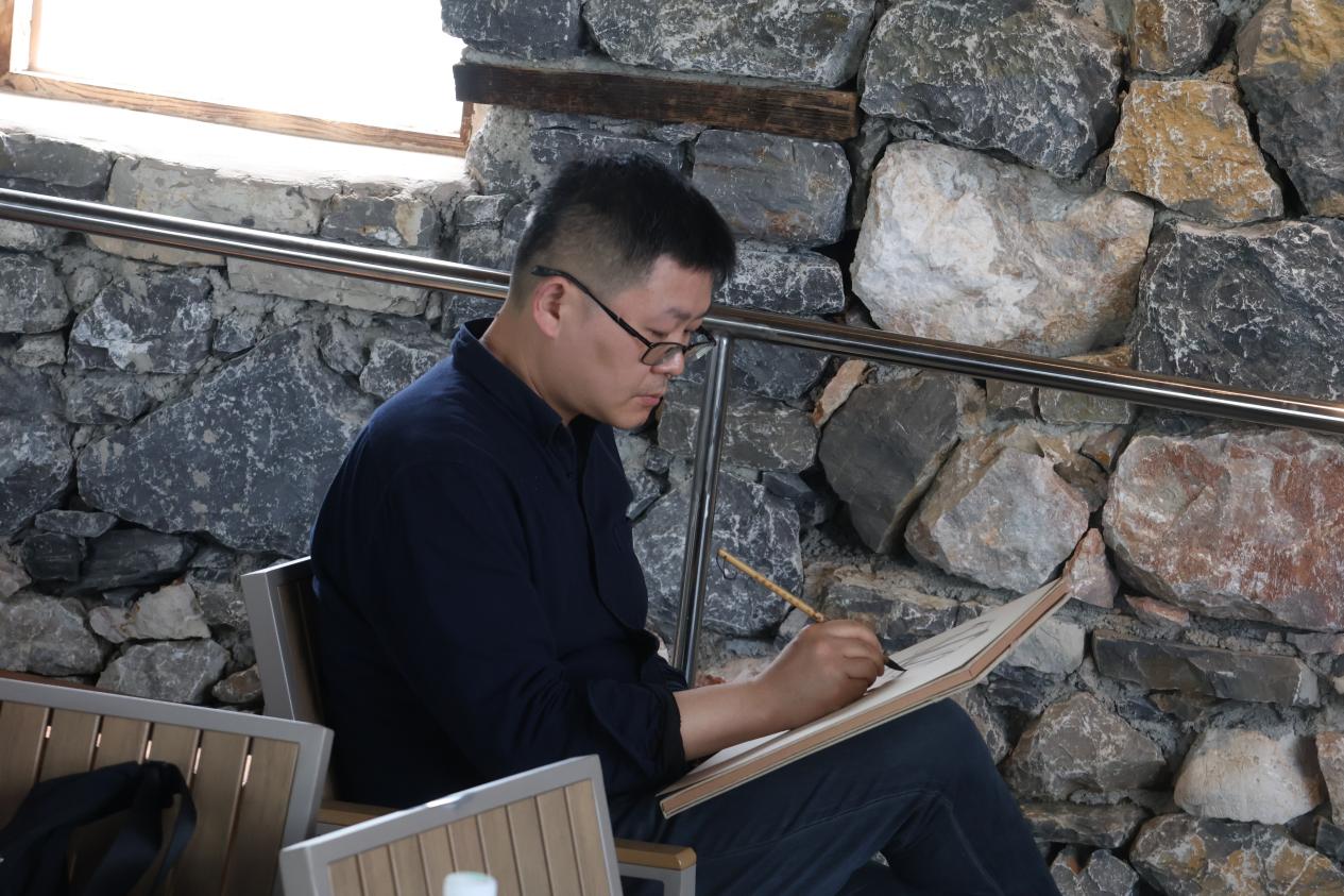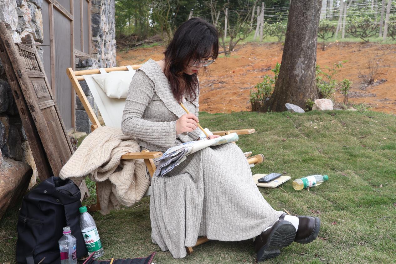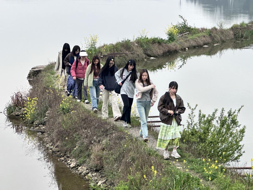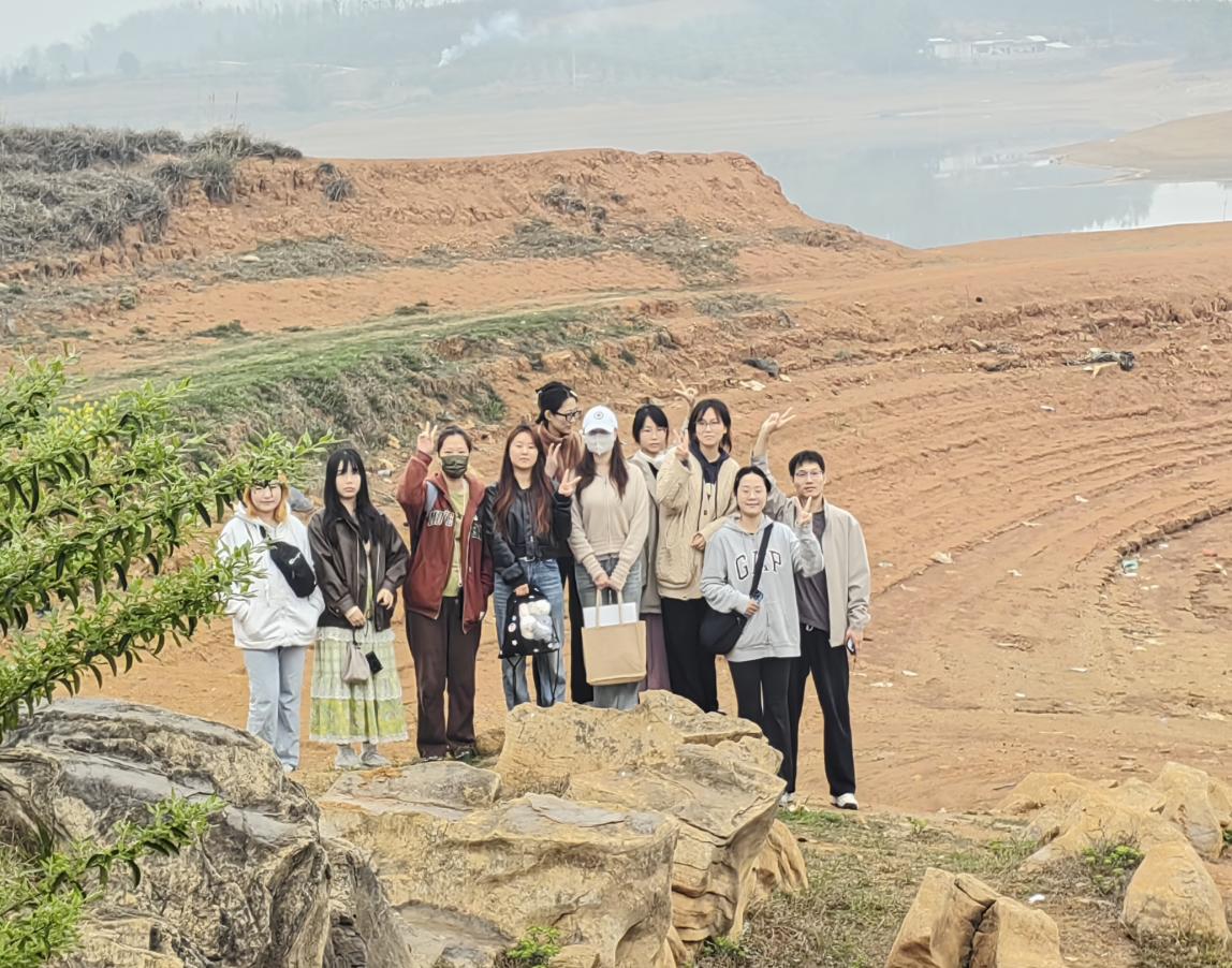 在蒙安夕舍民宿主理人王庆能的引导下,师生们沿着湖畔溯源而上,深入考察了明代屯堡遗址、生态茶园、樱花园等当地重要文化地标。右二村迷人的自然景致、古朴的乡村风貌以及热情好客的村民,为师生们的写生活动营造了理想的创作环境。