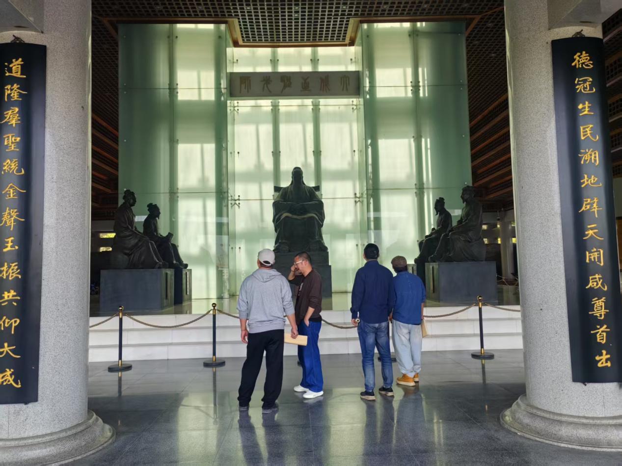 贵阳孔学堂融合了传统建筑美学与儒学精神,是一座极具文化底蕴的地标性建筑,其典雅庄重的氛围令人心生敬意。师生们依次走过泮桥、大成门、礼仪广场、大成殿,最终抵达象征儒学传承的杏坛。参观过程中,他们看到左侧的溪山书院与讲堂群,右侧的六艺学宫、乡贤祠、阳明祠及奎文阁。尤其引人瞩目的是大成门前高达 9.28 米的孔子行教像,庄严肃穆,寓意纪念孔子诞辰,彰显着儒学千年的传承与风范。