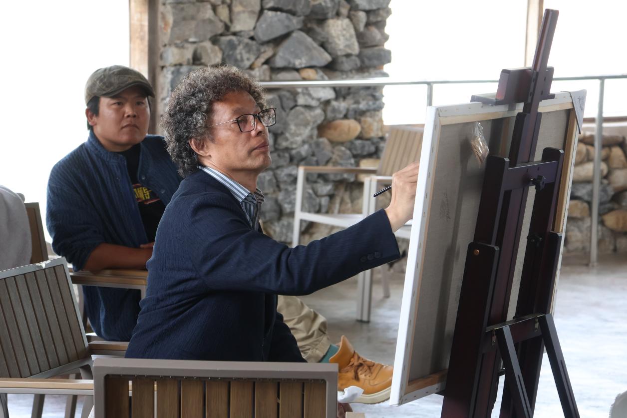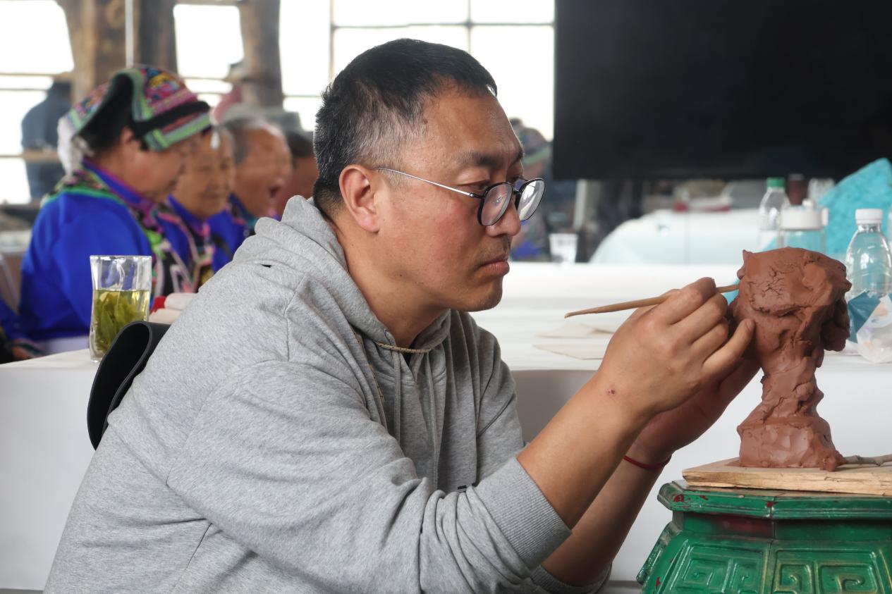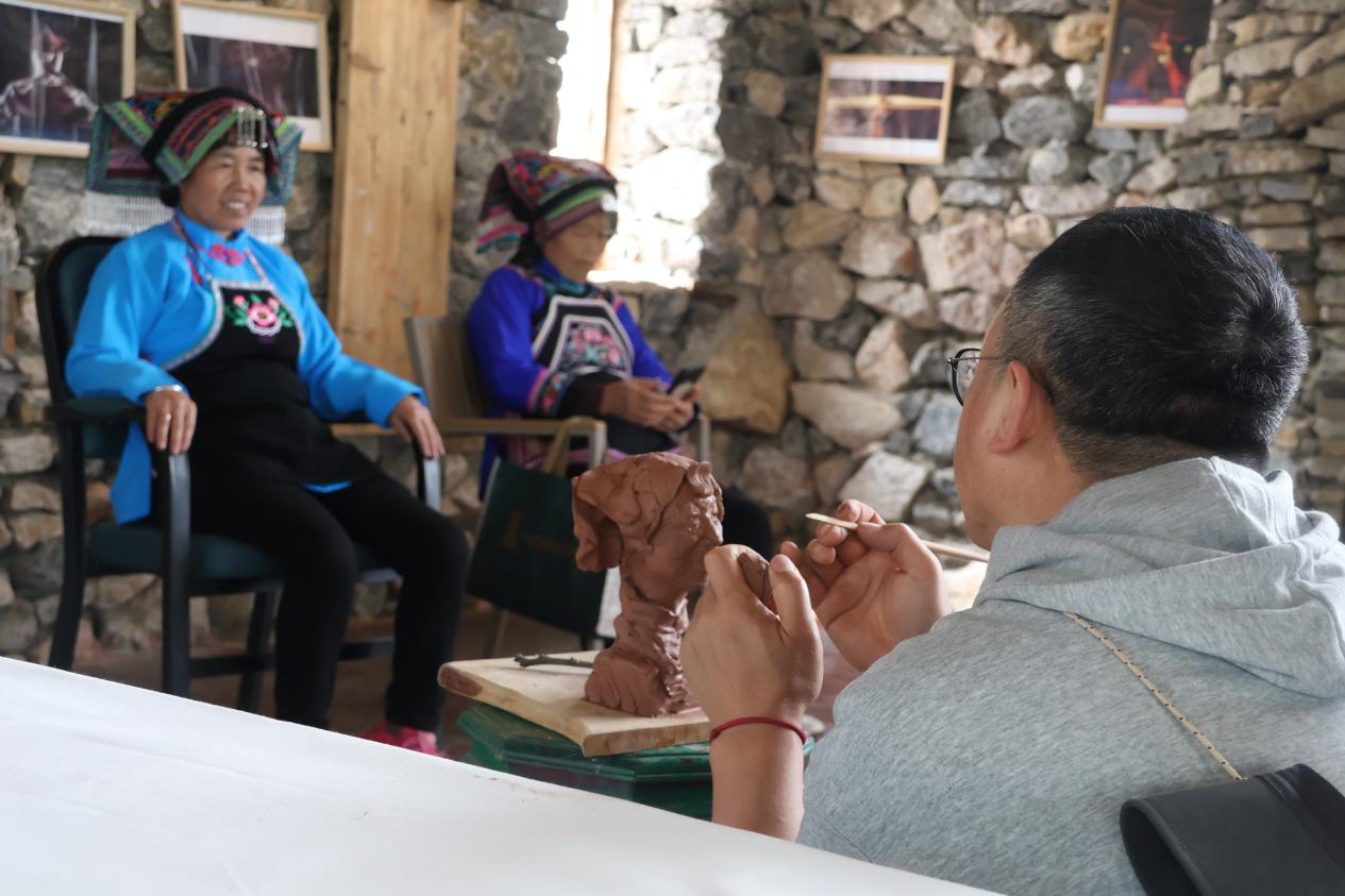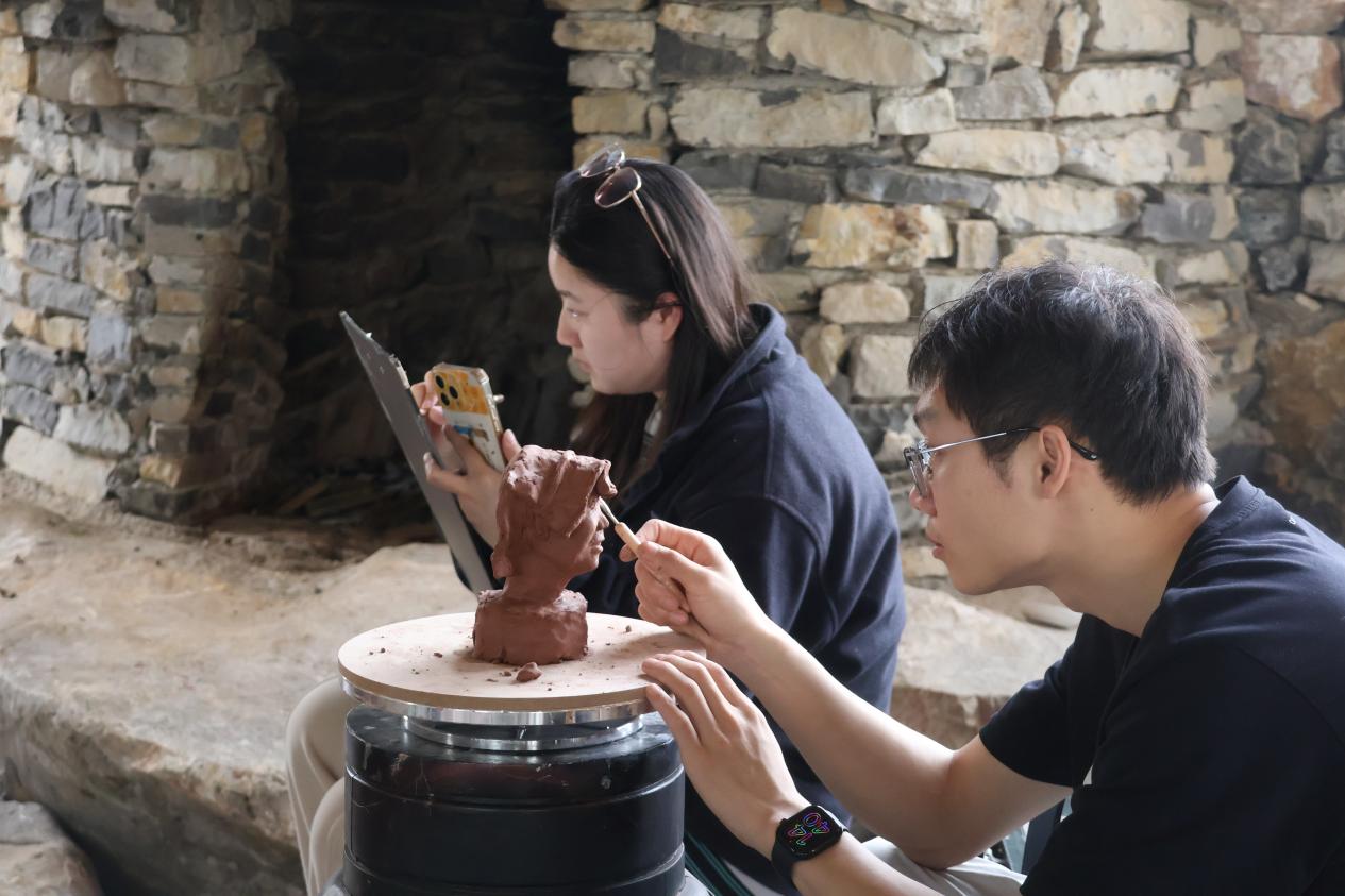 陆庆龙、刘德龙、任艳明三位老师分别针对右二村当地少数民族村民和自然风景,进行油画、国画、雕塑的示范创作,并悉心讲解相关技法,展现出多元的艺术表达方式。陆庆龙教授在现场示范时强调:“真正的艺术教育不应局限于画室之内,而应走进自然,在泥土的芬芳中感知生命的脉动。” 同学们认真观摩学习后,积极投身于创作实践。油画专业的学生运用刮刀,细腻地堆砌出红枫湖的粼粼波光,精准捕捉山岚氤氲的瞬息万变;国画组巧妙地将屯堡石墙的沧桑肌理转化为水墨皴法,在生宣纸上勾勒出岁月的痕迹;雕塑团队就地取材,利用红枫湖畔的陶土进行塑形,以当代艺术语言重新诠释民族图腾。这些即兴创作的作品,后续将通过写生作品展的形式回馈给当地。