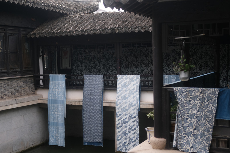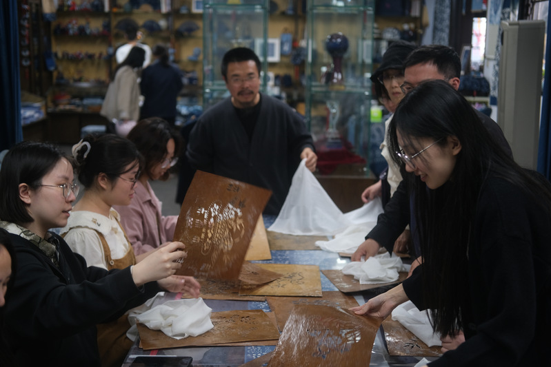 11日下午,团队走进南通蓝印花布博物馆,这座国内首家以蓝印花布为主题的专题馆,藏有明清以来的珍贵实物与工具。在国家级非遗传承人、中国工艺美术大师吴元新老师的导览中,师生们系统认知了蓝印花布刻版、刮浆、染色、刮白四大核心工艺,深刻领悟到“以刀代笔”的雕刻智慧与“以糊作墨”的防染精髓。纹样作为蓝印花布的灵魂,从梅兰竹菊的文人风骨到十二生肖的民俗意趣,从祥云瑞兽到江海浪纹,每处图样都诠释着“图必有意,意必吉祥”的东方美学密码,更通过“蓝底白花”的视觉语言,展现着江海文化中海纳百川的精神特质。