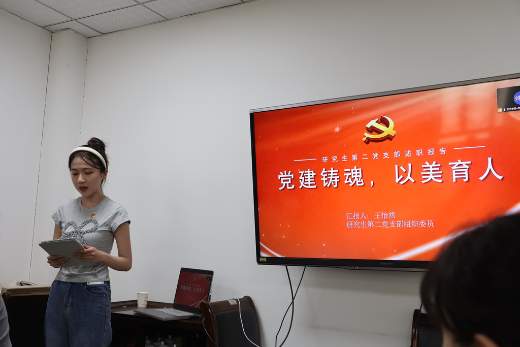 大会的第二个环节,听取和审议了上一届党支部委员会工作报告,报告全面回顾了过去三年支部在思想建设、作风建设、组织建设等方面取得的成效。上届研究生第一党支部组织委员任欢、研究生第二党支部组织委员王怡然分别作工作报告,总结上任以来的各项工作和成绩。研究生第一党支部坚持以“党建引领、学科发力、艺术赋能”为核心,不断探索“党建+美育”协同育人模式,注重制度建设与品牌活动双轮驱动,开展“党建领航,墨香入校”“图绘华夏梦,‘艺’路心连心”等特色活动,获“2023年度最佳党日活动”“2024年优秀研究生党支部”等荣誉,任欢代表上届委员会希望下一届支部委员会接续奋斗、守正创新,聚焦理论学习实效化、党员管理精细化、品牌建设专业化,探索“艺术+思政”融合新路径。研究生第二党支部立足专业实践,以“党建+美育”工作机制开展支部建设,紧密围绕新时代党的建设总要求和组织路线,从美术、音乐、戏剧三个维度创建党建品牌,通过“党建领航,墨香入校”“音乐思政讲座”“观看红色话剧《1912》”等多维活动达到党建与美育的双融双促效果。2024年支部也入选“南京大学研究生示范党支部领航计划”,王怡然代表上届委员会希望下一届支部委员会能进一步深化“实践育人”理念,推动党建与社会服务深度结合,提升党员服务社会的能力。