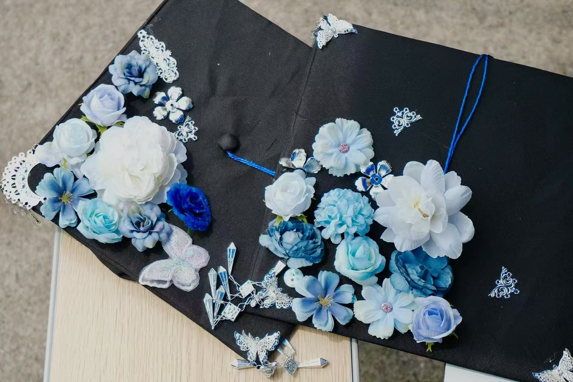 参与者用干花束、珍珠链和丝带装饰硕士帽,丝带所系住的不只是花叶,更是校园角落里那些每日亲历的晨昏故事。当正午的阳光穿过薄如蝉翼的压花,二者的相逢构筑出一整个春天离开前最后的璀璨。