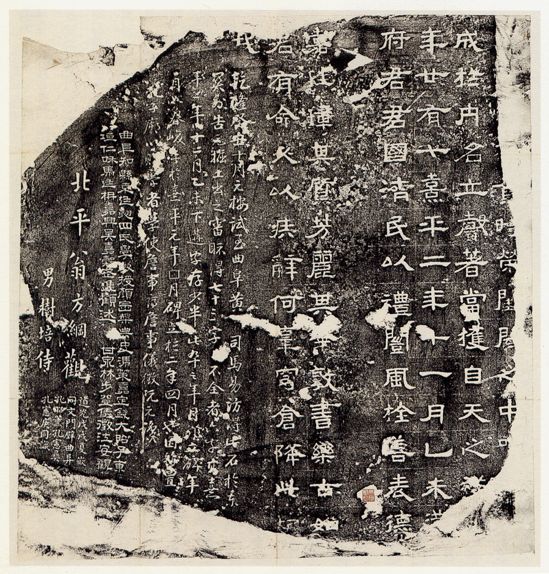 汉魏碑刻陈列馆中,还有不少东汉碑版与清中叶著名学者有着千丝万缕的关系:如《熹平二年残碑》由黄易于乾隆五十八年(1793)在曲阜东关外庙壁访得,后由阮元移入孔庙,阮元、翁方纲、翁树培均有题记;《汉石人麃君亭长刻字》亦由阮元于乾隆五十九年(1794)从曲阜东南张曲村移入城内;《竹叶碑》由何元锡于乾隆五十四年(1789)洗碑精拓,得以重见天日;《孔君墓碑》也是由何元锡于乾隆五十八年(1793)在孔林墙外发现,碑右下并有翁方纲题记。