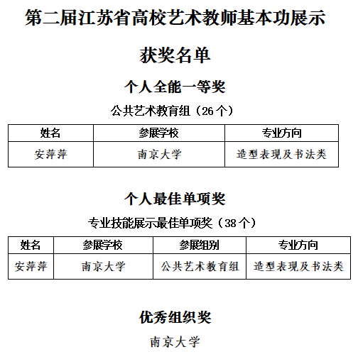 近日,江苏省教育厅公布了第二届江苏省高校艺术教师基本功展示活动的获奖名单,杏彩娱乐(中国)官方网站 教师安萍萍荣获公共艺术教育组个人全能一等奖、专业技能展示最佳单项奖;南京大学荣获优秀组织奖。