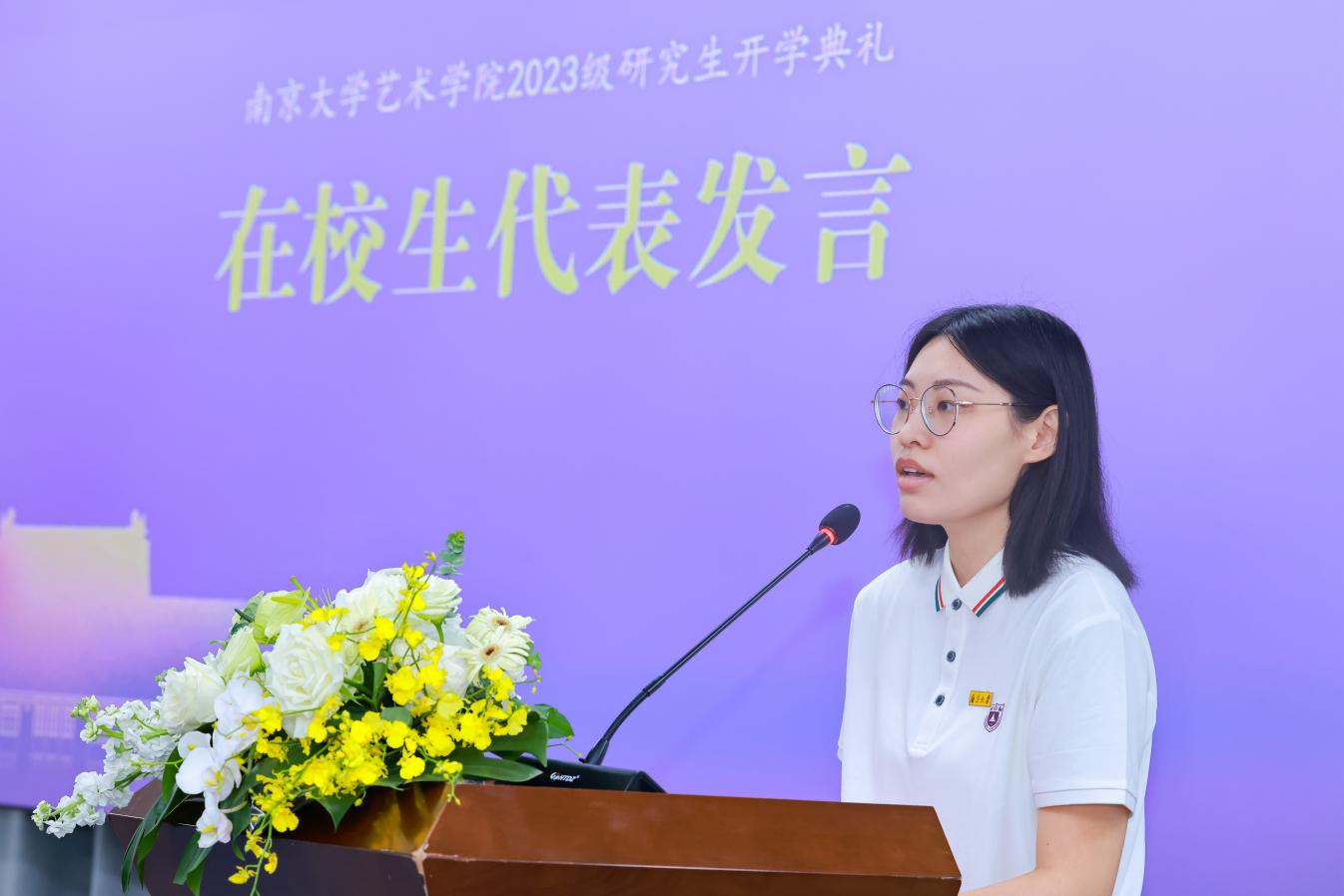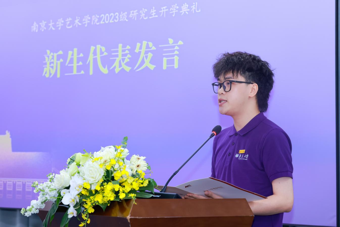 2023级硕士研究生张恩培同学作为新生代表,从对个人身份转变的思考切入,分享了三点感悟。首先,作为一名研究生,要在学术研究中坐得了“冷板凳”,面对浩瀚的知识海洋要投入时间与精力专注其中;其次,作为杏彩娱乐 的学生,要将艺术理论知识与自身技能相结合,在实践中不断探索并形成对学习、生活和社会的认知;最后,作为新时代的青年,不仅要弘扬中华优秀传统文化,也要勇于探索新领域,保持对学科前沿热点的敏感度。