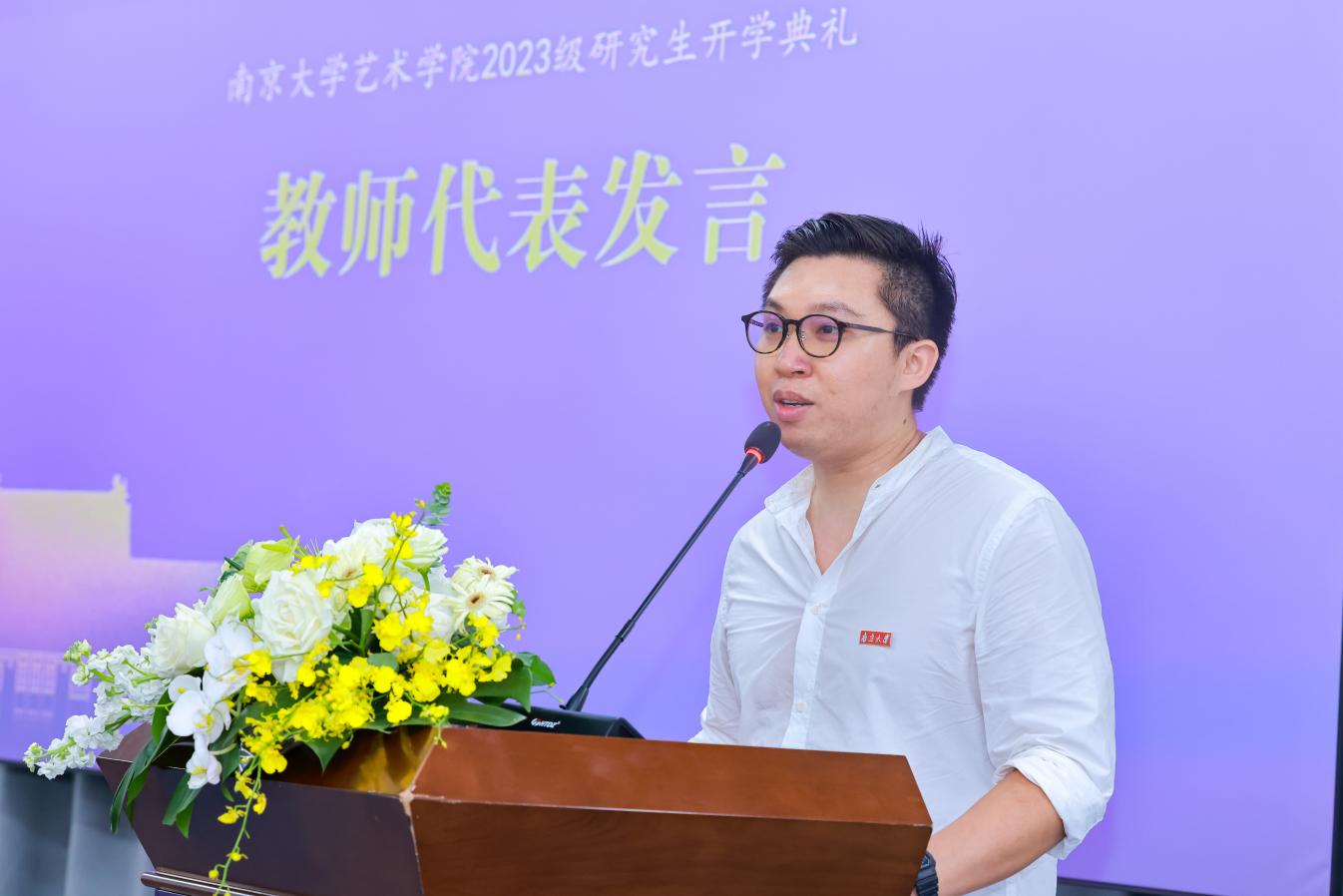 李牧副教授作为教师代表发言,以“我能为艺术做什么”为题,结合亲身经历分享与艺术亲密接触的难忘瞬间,他认为艺术在人生求索过程中不断赋予其希望、动力和激情。同时,李牧老师分享了自己对当下艺术面临挑战和困境的思考,认为通过跨学科的实践可以发现艺术发展的新方向和新可能,鼓励新生投身跨学科、跨媒介、跨领域的理论研究与实践中,助力艺术学科的发展,为艺术做些什么!