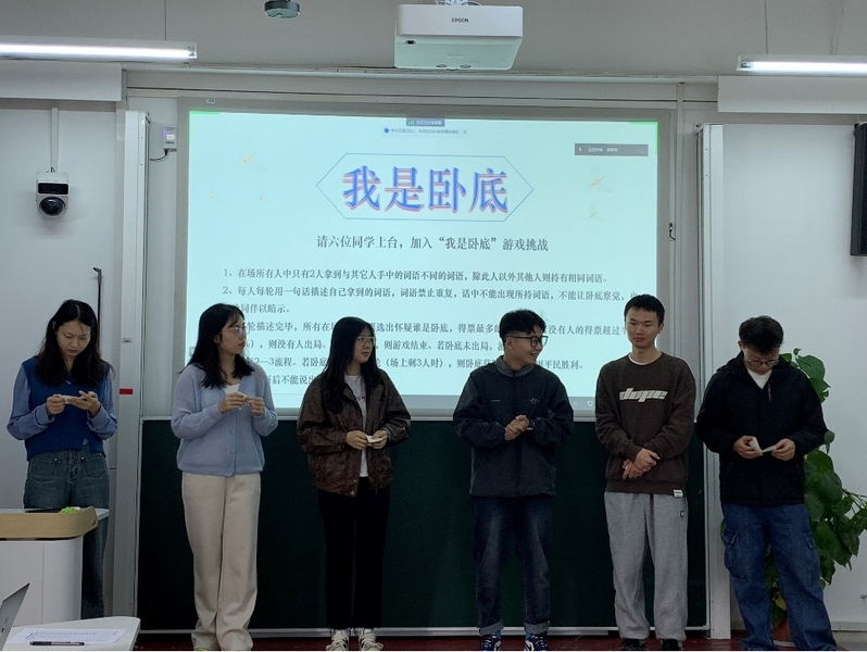 活动伊始,刘航、宋洁、林静儒、张世川、马武周和周尚六位团员受邀上台参与“谁是卧底”游戏挑战。在游戏中,团员们根据各自抽到的“平民词”或“卧底词”,针对“坚持把马克思主义基本原理同中国具体实际相结合”、“坚持把马克思主义基本原理同中华优秀传统文化相结合”两个词条展开描述。通过上述游戏,团员们深刻领悟到“两个结合”需要把握好“魂脉”和“根脉”,“魂脉”即马克思主义,亦即党和国家的指导思想;“根脉”即中华优秀传统文化,亦即中华民族的历史文化基因。“魂脉”和“根脉”都不能脱离站立的大地,这就是“立足点”和“出发点”,即当代中国实际。