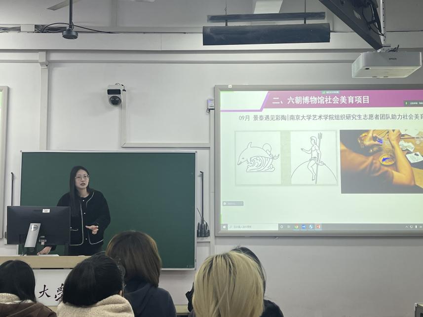 苏霁虹同学重点介绍了“六朝博物馆社会美育志愿服务项目”,该项目在杏彩娱乐 团委指导下,组织杏彩娱乐 研究生志愿者团队以美育课程教学、海报设计等方式,参与南京六朝博物馆社会教育活动。目前,结合六朝博物馆“希腊时代彩陶及普利亚艺术文化特展”,已面向社会公众开设“景泰遇见彩陶”、“纸塑流光”两次课程。后期,该项目还将继续整合馆校力量,开设为期一年的社会美育课程,以专业所长,推动实现艺术与人的深层联结,让艺术成为生活的一部分,为铸就社会主义文化新辉煌贡献青年力量。