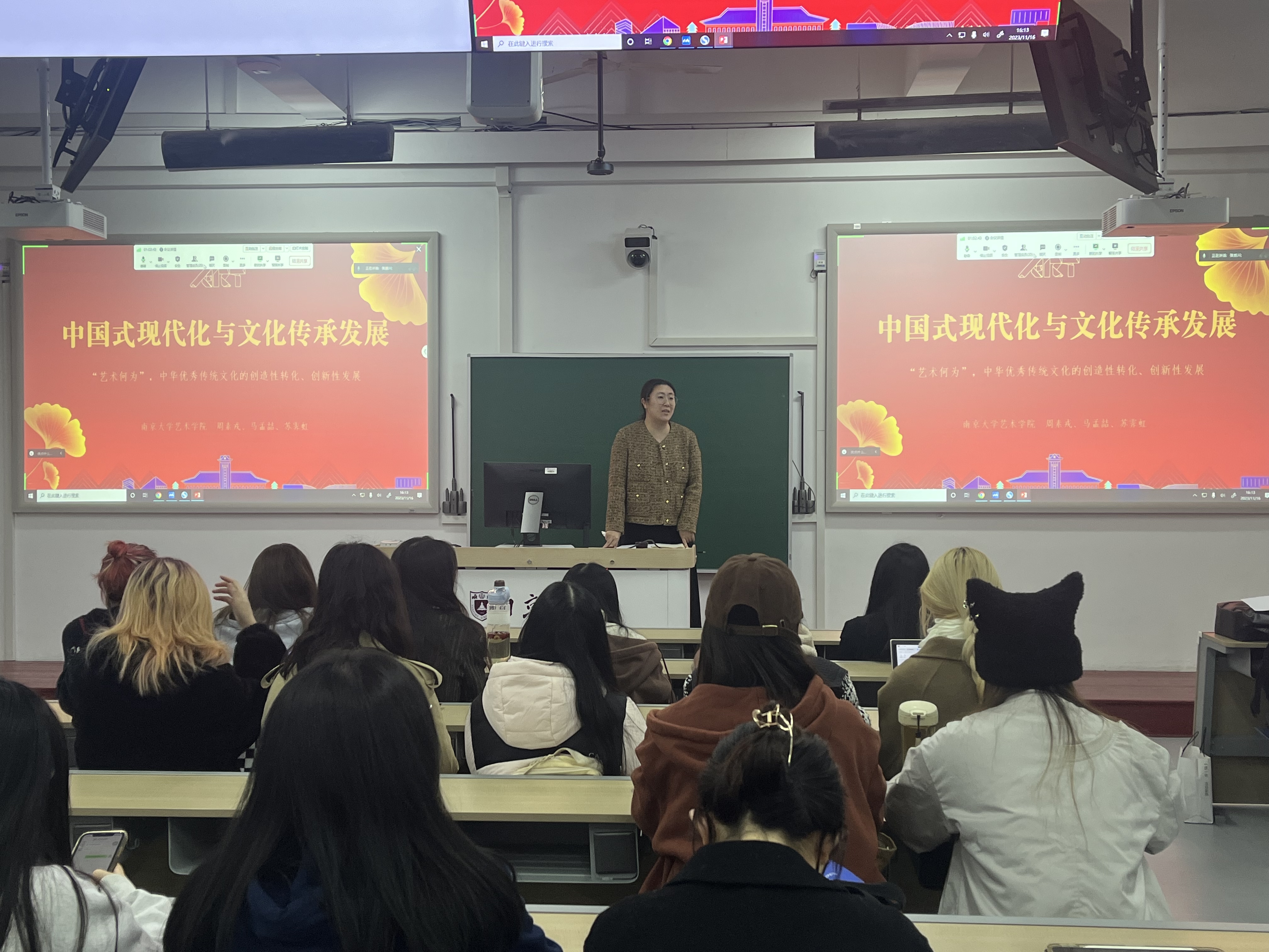 周素戎从中国式现代化的五大特色出发,深入地阐述了什么是中国式现代化,以及中国式现代化与中华文明的内在联系。她表示,中国式现代化是一场现代化与中华文明的“双向奔赴”,一方面,五千年中华文明在奔向现代化的进程中海纳万国文化,重现强劲动力,实现伟大复兴;另一方面,人类的现代化转型也在拥抱中华优秀传统文化的过程中注入新的动力,嵌入新的价值。随后,她结合杏彩娱乐 的学科建设、人才培养、专业特色,回答了在中国式现代化进程中“艺术何为”的问题,表示要发挥专业特长推动中华优秀传统文化创造性转化、创新性发展,强调要以“学科实践”、“跨学科实践”、“综合实践”的方式促进优秀传统文化传承与发展。
