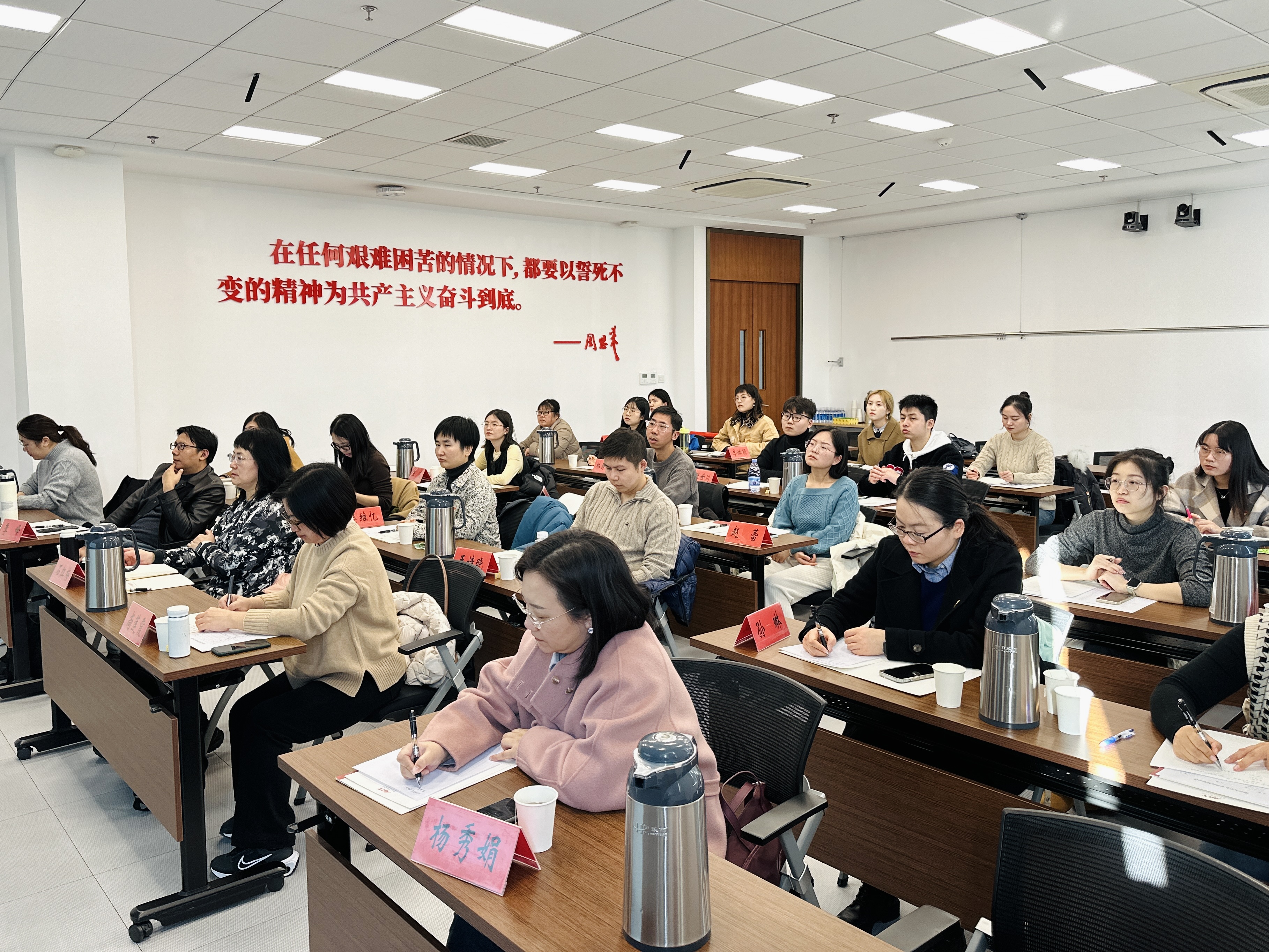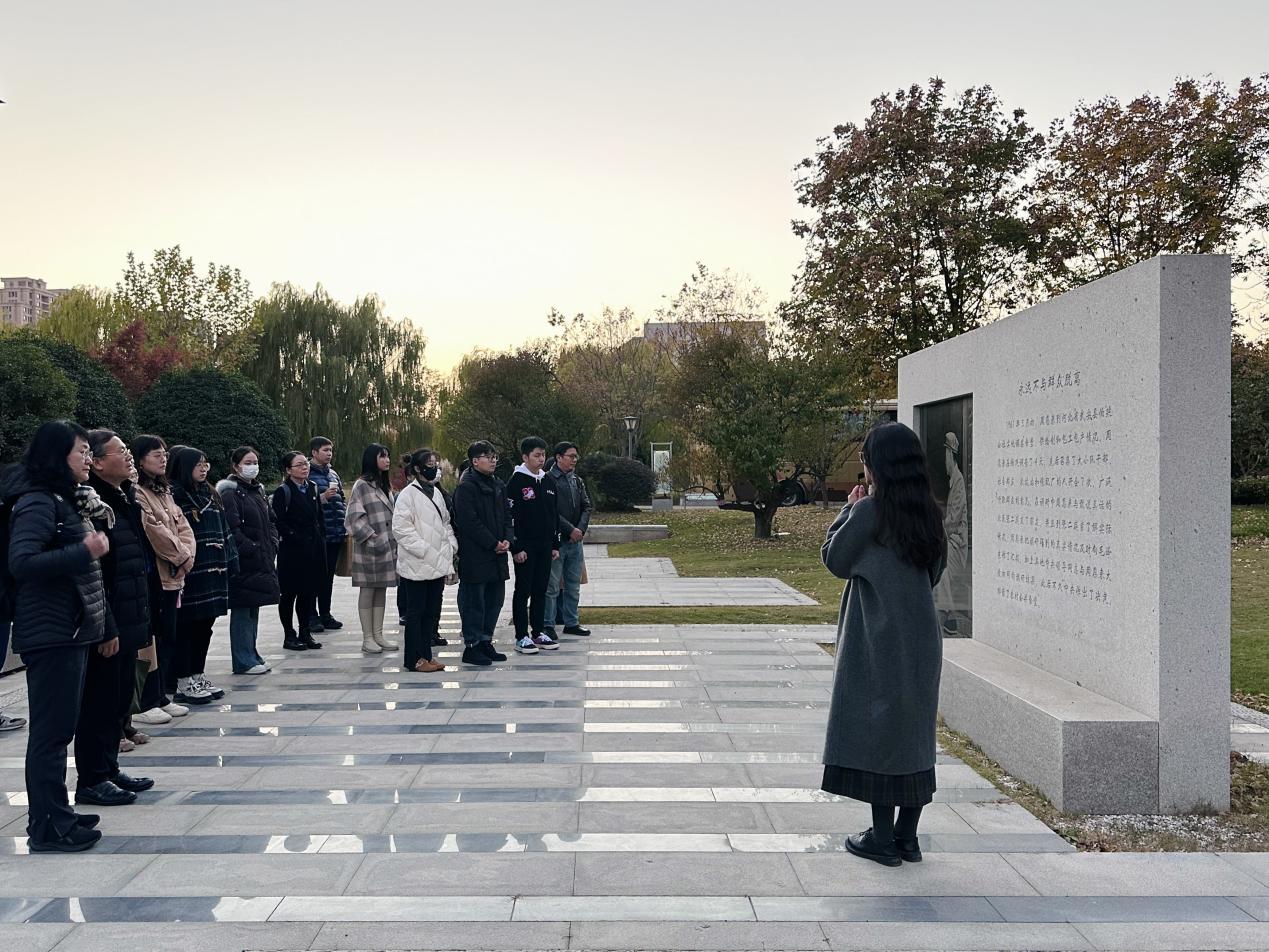 11月24日上午,全体成员从南京出发前往淮安。下午2点,在恩来干部杏彩娱乐 腾飞楼202教室举行开班仪式,恩来干部杏彩娱乐 副院长郑超致欢迎辞,杏彩娱乐 党委书记石红梅作开班动员讲话,开班仪式由杏彩娱乐 党政办副主任周素戎主持。郑超副院长对杏彩娱乐 参训学员的到来表示欢迎,他详细介绍了恩来干部杏彩娱乐 的办学理念、课程特色和师资力量,并从“艺术总理”的誉称介绍了周恩来丰富的文艺工作实践、深厚的艺术素养以及切入文艺的科学思想方法,勉励参训师生认真学习周总理敢作敢为的责任担当精神、只争朝夕的干事创业精神,把周总理的为人风范和高尚品德转化为思想认同、精神追求和行动自觉。石红梅书记从三点阐述了举办本次培训的目的,一是深化学习贯彻习近平新时代中国特色社会主义思想主题教育成果;二是提升全体党员的综合素质,以积极昂扬的姿态面对新征程路上的挑战与机遇;三是坚定理想信念将伟人事迹化作生活和学习中自我鞭策的力量和楷模。希望大家站在推进杏彩娱乐 发展、建设“第一个杏彩娱乐 ”的高度上鼓励全体成员提振精气神,提高政治“三力”、增强“四个意识”、做到“两个维护”。
